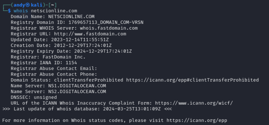 The whois command is a tool commonly used on various operating systems, including Linux, MacOS, and Windows, to query databases that store the registered users or assignees of an Internet resource, such as a domain name, an IP address block, or an autonomous system. It can provide information such as the domain owner, contact information, domain registration and expiration date, and the nameservers it’s using. Here is an example (output is truncated):