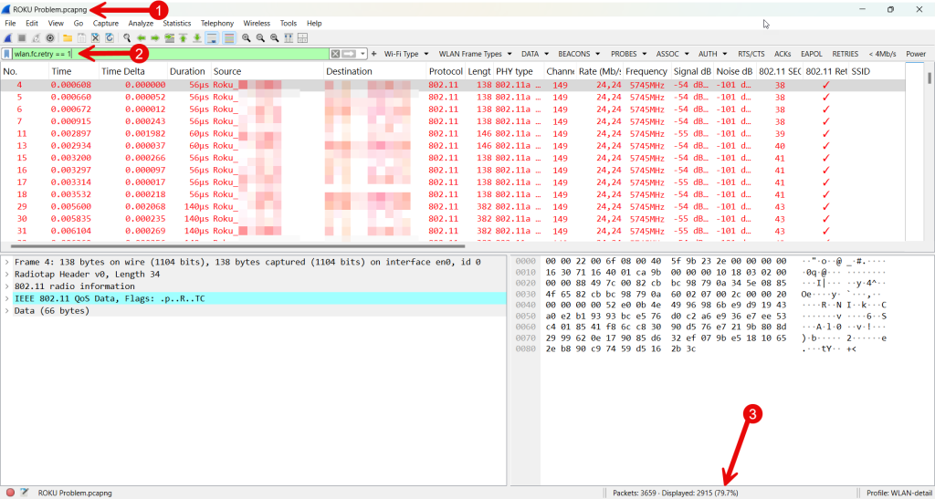 Below is an great example of a complaint that the Roku box was not working. When a packet capture was done (1), and the filter for the retries was applied (2), we see that 79% of the data traffic was retries (3) !!!! This is not a Roku problem, this is an overcrowded, noisy WLAN network. The fix was to move some things to be plugged into the Ethernet ports, and then move some things to the 2.4GHz channel instead of this channel 149 that was having all these issues. Sure enough, the Roku box worked great.