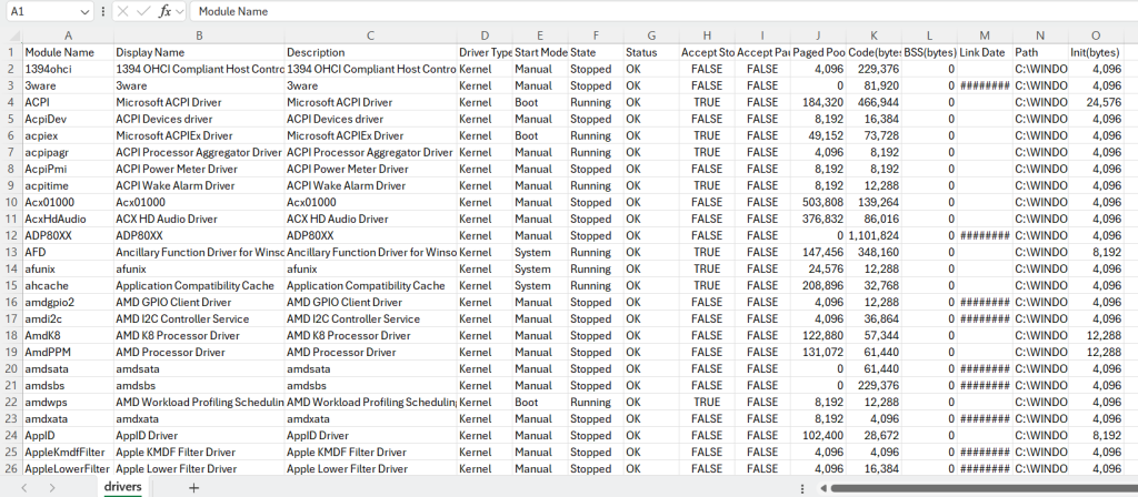 The results are displayed in a table format in the Command Prompt window. If you want to perform more detailed analysis, you can direct the Driver Query to save the results in a CSV file so you can open them in a spreadsheet application such as Excel. To do so, type the following on the command line: