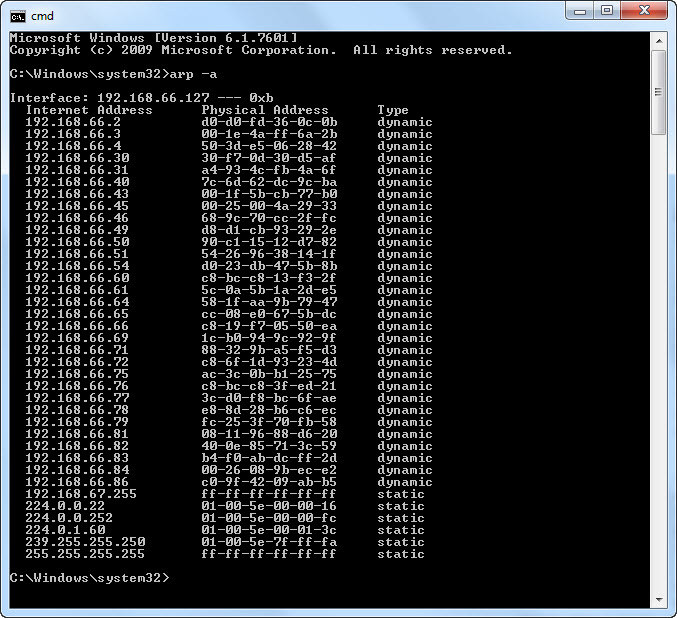 - arp -a – this one shows the static and learned (dynamic) MAC addresses. MAC addresses that are dynamic are from other devices in the user’s LAN. The first three numbers separated by dashes are the Organizationally Unique Identifiers or OUI’s. These identify the manufacturer. A list of the OUI’s can be found at http://standards.ieee.org/regauth/oui/oui.txt . So let’s say I see MAC address 00-0F-61-00-D5-29. The 00-0F-61 is the OUI. If I search that document I see that is an HP device. This same procedure could be followed looking at the MAC table inside the Linksys/D-Link/Netgear device as well, except there you don’t issue a command, you look at a particular screen.