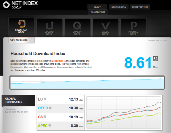 Based on millions of recent test results from Speedtest.net, there is an index that compares and ranks consumer download speeds around the globe. Also plotted is the value is the rolling mean throughput in Mbps over the past 30 days where the mean distance between the client and the server is less than 300 miles. The following screenshot is from the web site called Net Index by Ookla.