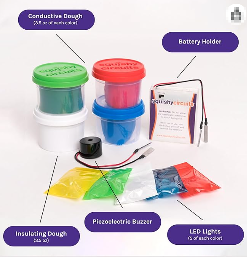 Yep, you read that right. Two types of dough—one conductive (made with salt), the other insulating (made with sugar)—let kids build real working circuits. They can explore parallel and series connections, light up LEDs, make switches, and so much more.