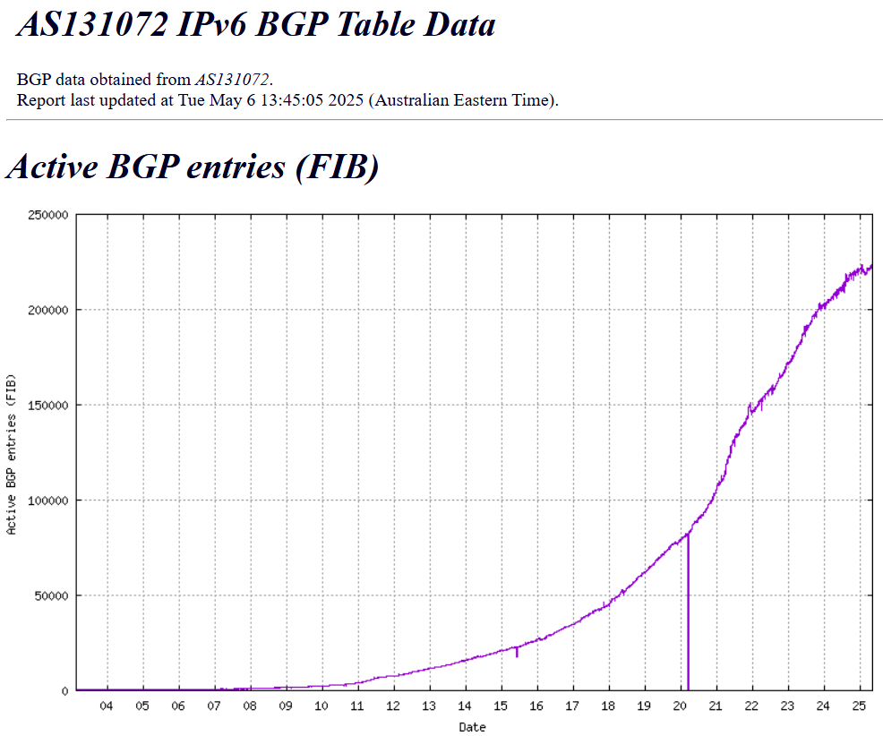 Back to IPv6: You can always put this growth into perspective by looking at the global BGP table for IPv6 (the source is https://bgp.potaroo.net/v6/as2.0/index.html: