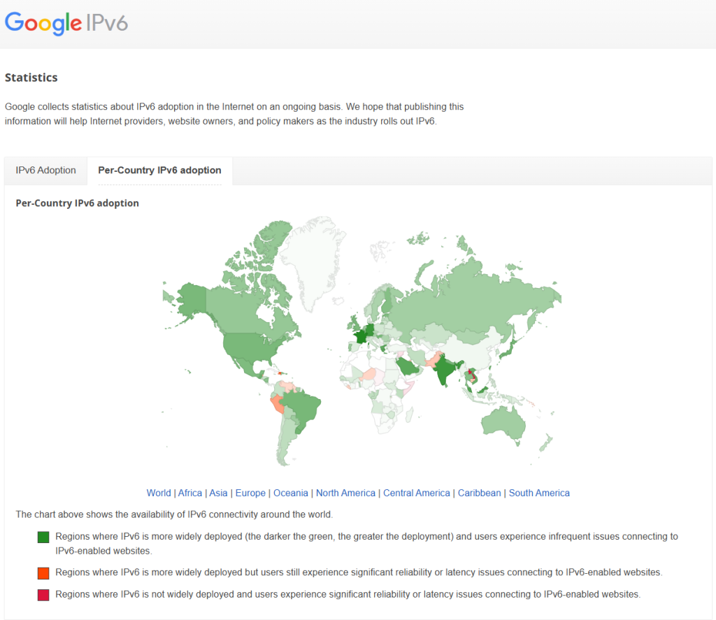 Here is Google’s view of IPv6 adoption (you can find the latest views here: https://www.google.com/intl/en/ipv6/statistics.html#tab=ipv6-adoption ) :
