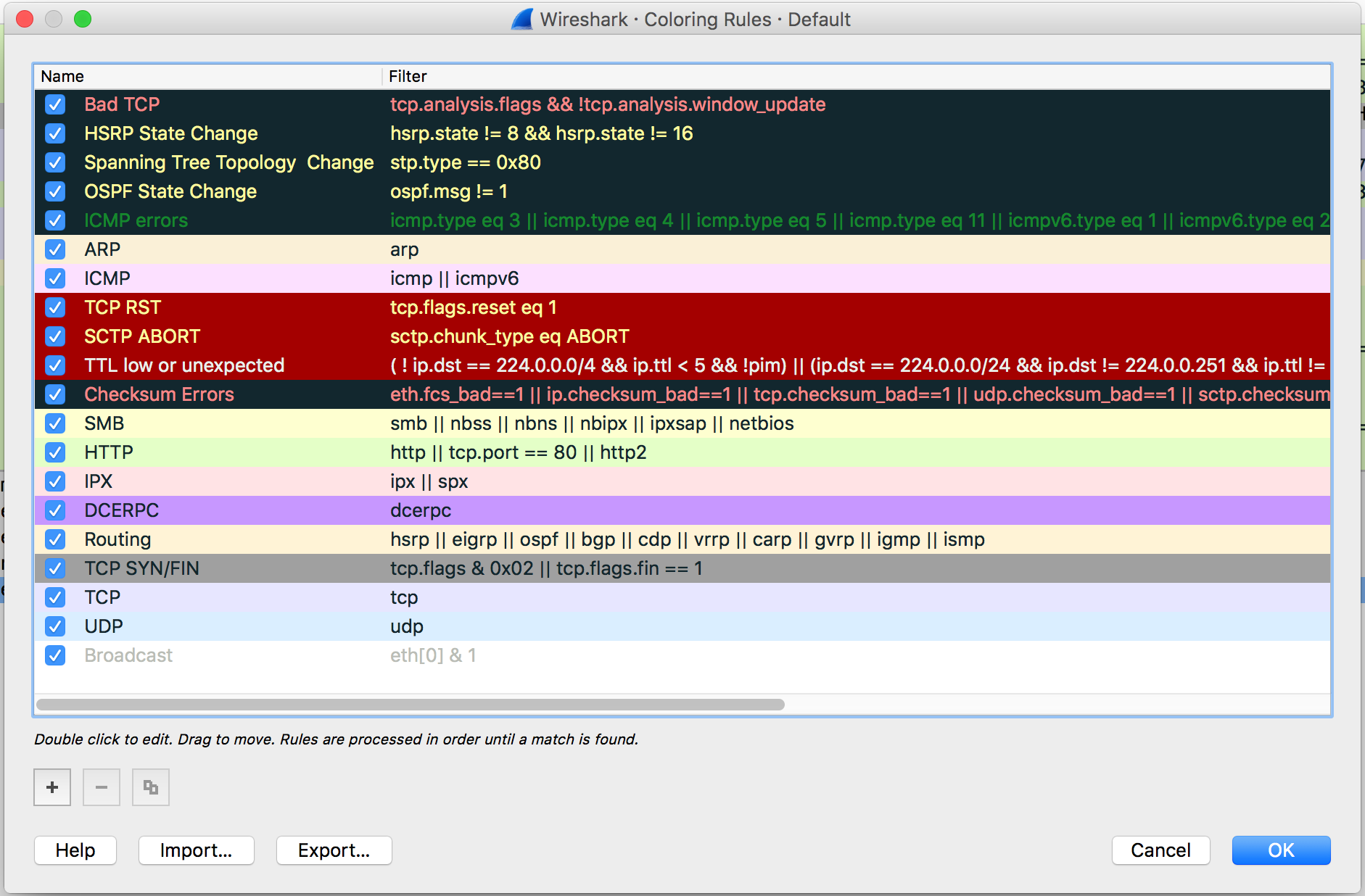 If the Wireshark host performs TCP and UDP checksum offloading – the process of calculating the checksum on the NIC and not by the protocol stack – Wireshark will trip on this. All the TCP and UDP packets will be colorized Red on Black and the Expert analysis function will report checksum errors.