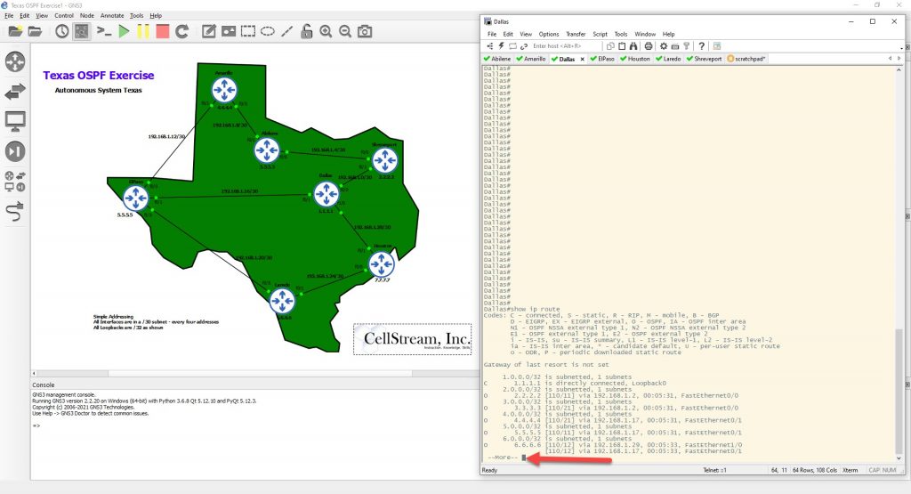 One of the most annoying things in Cisco IOS is its old roots in the 23 line terminals. Every 23 lines, you get a –More– pause, to which you have to hit the space bar to continue the output.