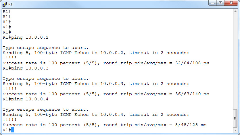 Sending 5, 100-byte ICMP Echos to 10.0.0.1, timeout is 2 seconds: