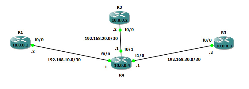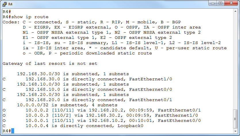 We begin with a normal routed network where all the routers R1, R2, R3 and R4 can see each other. Here is the routing table in R4:
