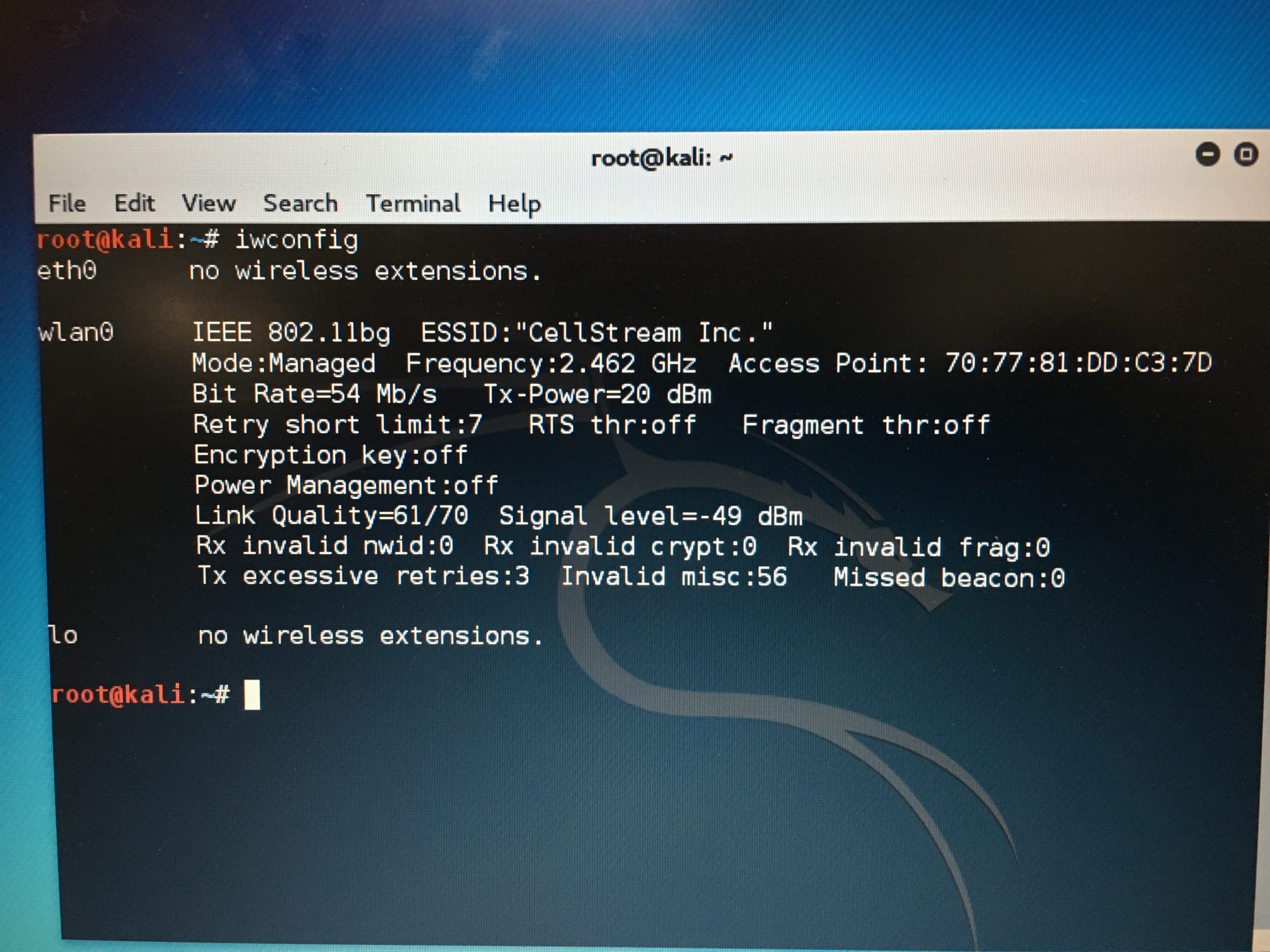 Lastly, I brought the interface back up with ‘ifconfig wlan0 up‘.