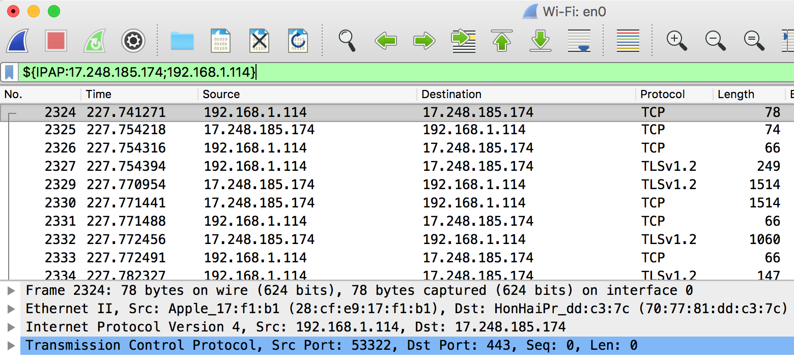 The normal display filter would look like this: ip.addr==17.248.185.174 && ip.addr==192.168.1.114