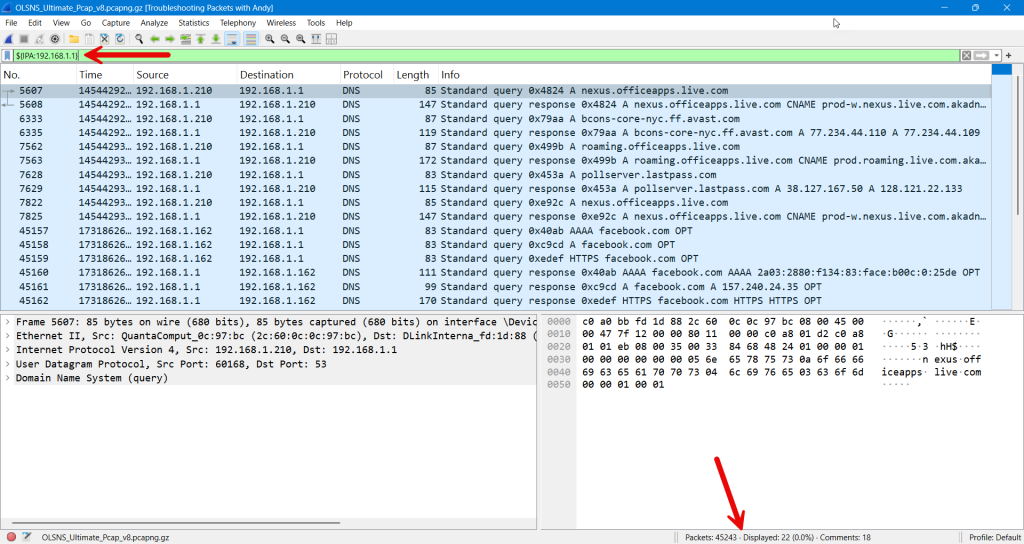 | n/a | Find all IP addresses that match the Destination IP of current selected packet | ip.addr == ${ip.dst} | n/a |