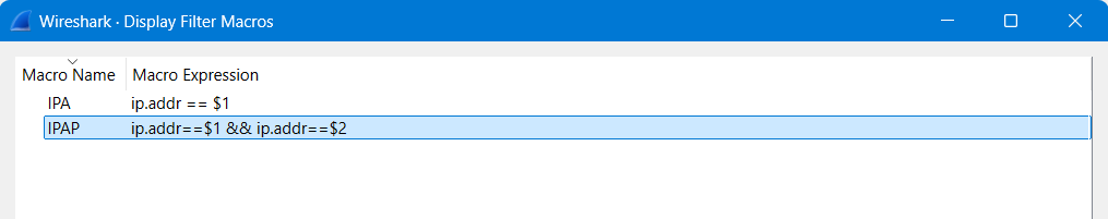 Let’s say we wanted to find a particular IP address pair. One option would be the Conversation Filter. Or we could create a macro based on a more complex filter syntax. We will have two variables: $1 and $2 for the two addresses.