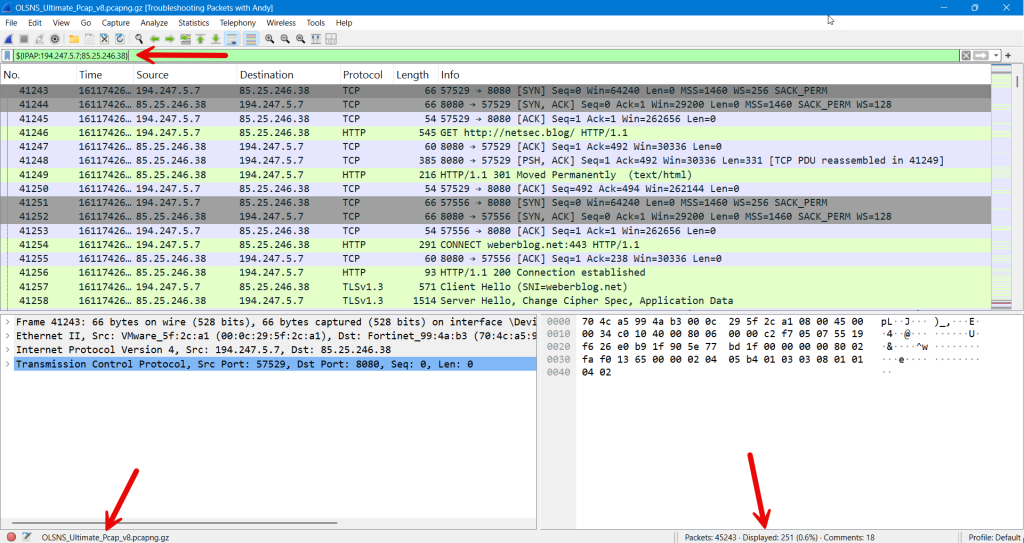 Now if I want to find a set of packets between an IP address pair, I simply type ${IPAP:194.247.5.7;85.25.246.38} in the display filter:
