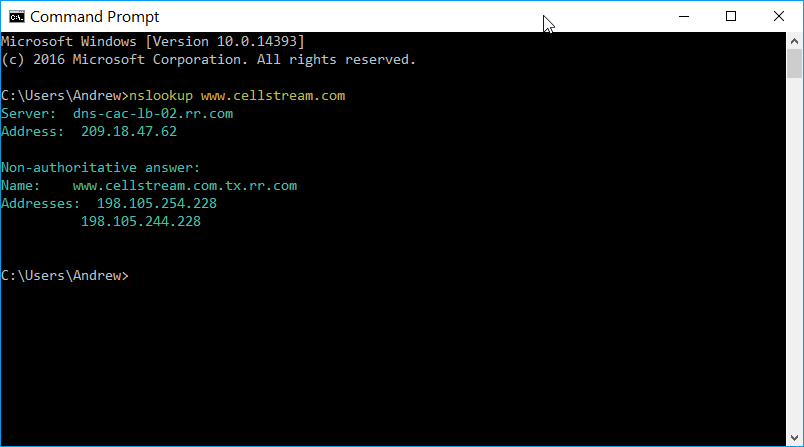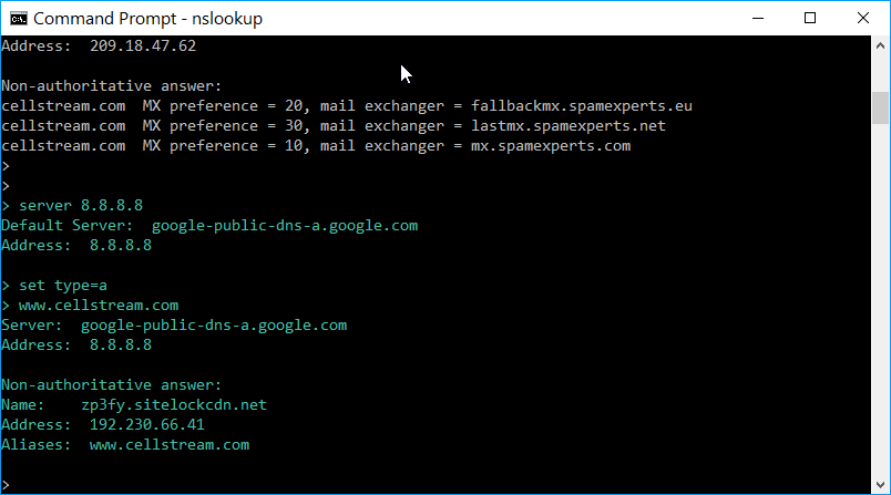 At the > prompt enter the following command: nslookup www.cellstream.com