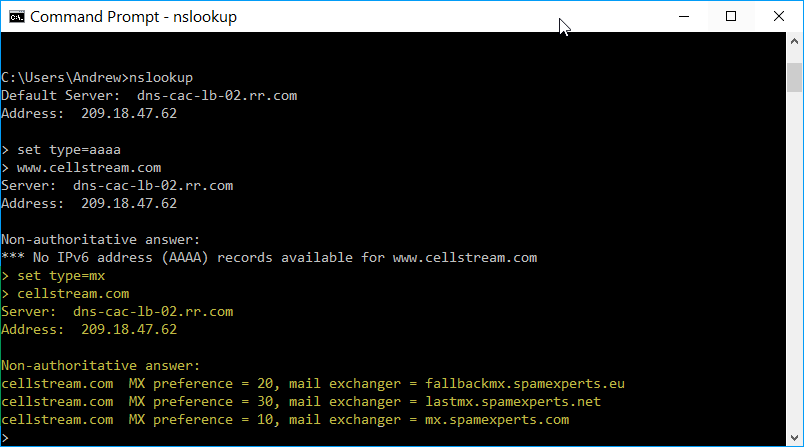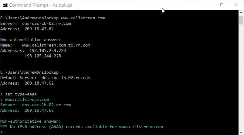 First let’s specify the record type we want to query. Let’s see if www.cellstream.com has an IPv6 address. That would be a ‘AAAA’ record type.