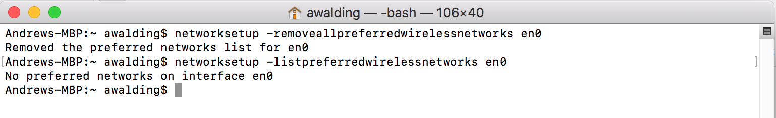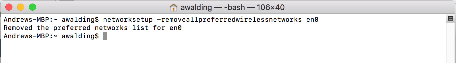 networksetup -removeallpreferredwirelessnetworks en0