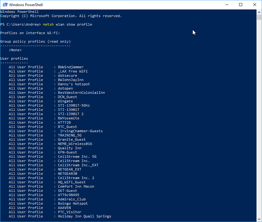 You will get a list of the saved Wireless networks. Here is a truncated example:
