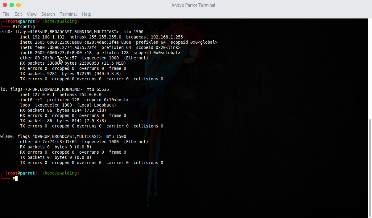 In my example below, I have a laptop running Parrot Linux natively. I have my Ethernet plugged in (eth0) and I have a Wi-Fi built in wireless adapter. That said, you should also be able to do the process on a VM running Parrot as long as the Wi-Fi adapter is connected to the VM. It may have to be a stand alone USB Wi-Fi adapter, however.