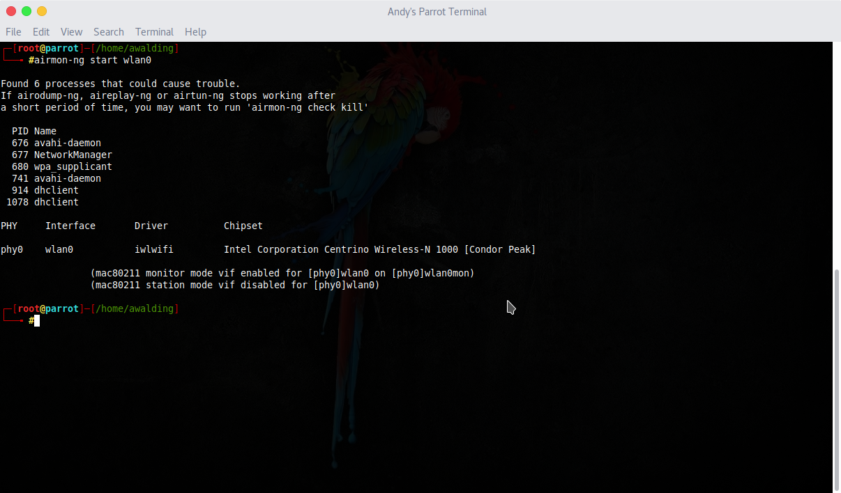 We see that the wlan0mon interface is now started. In other Linux distributions it may be called mon0.