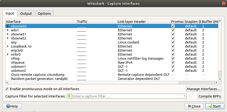 In the Promiscous mode – I selected Allow All. Then clicked on OK, and started the VM. It made no difference, I still could not capture this VM traffic on the VirtualBox interfaces in Linux nor in Windows.