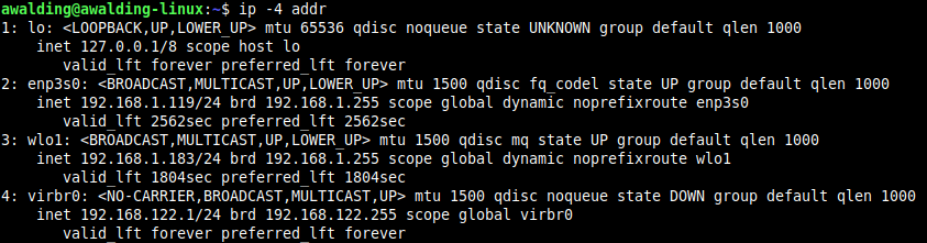 What if you just wanted to view the IPv4 addresses? Use the ‘ip -4 addr’ command: