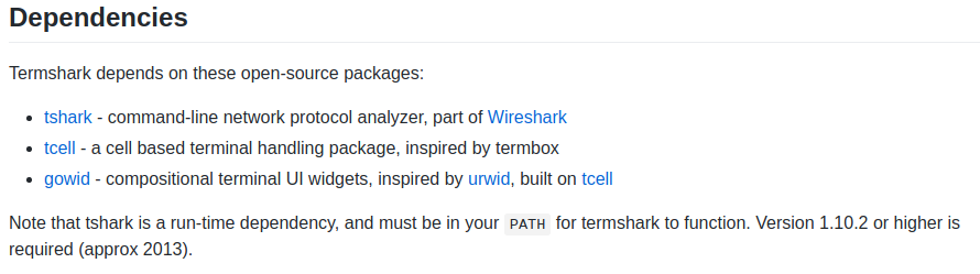 A note up front: there are critical dependencies for the installation to work, so be carefull not to go down the path we did which was a) clone the github repository, and b) try to run termshark. It won’t.