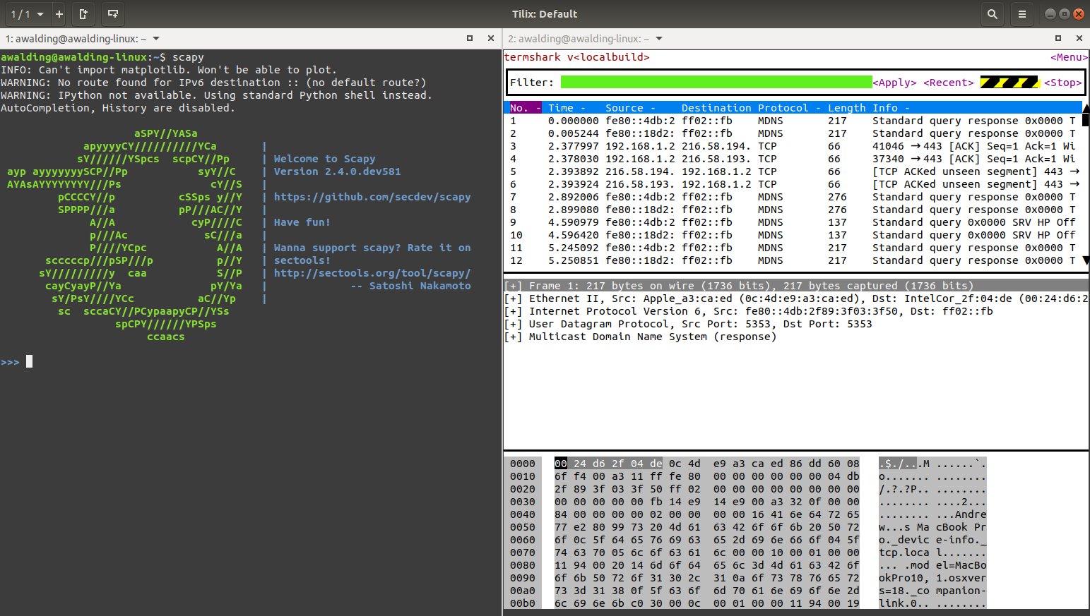Here I am using SCAPY and watching the results in termshark, I use Tilix to create the multiple terminal windows: