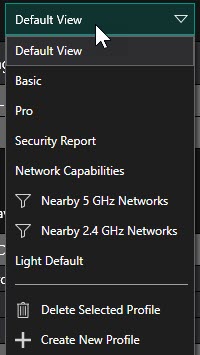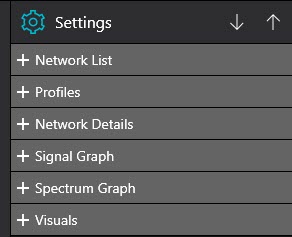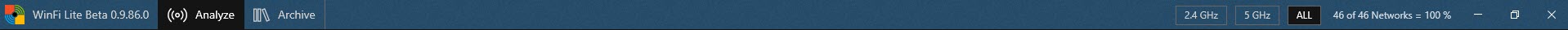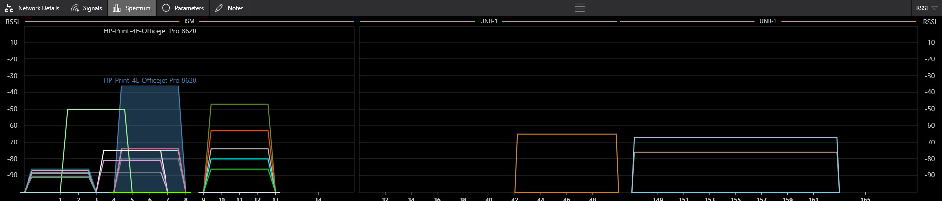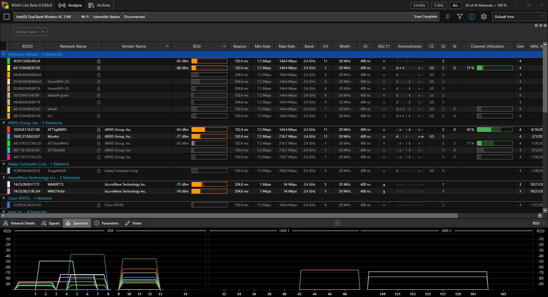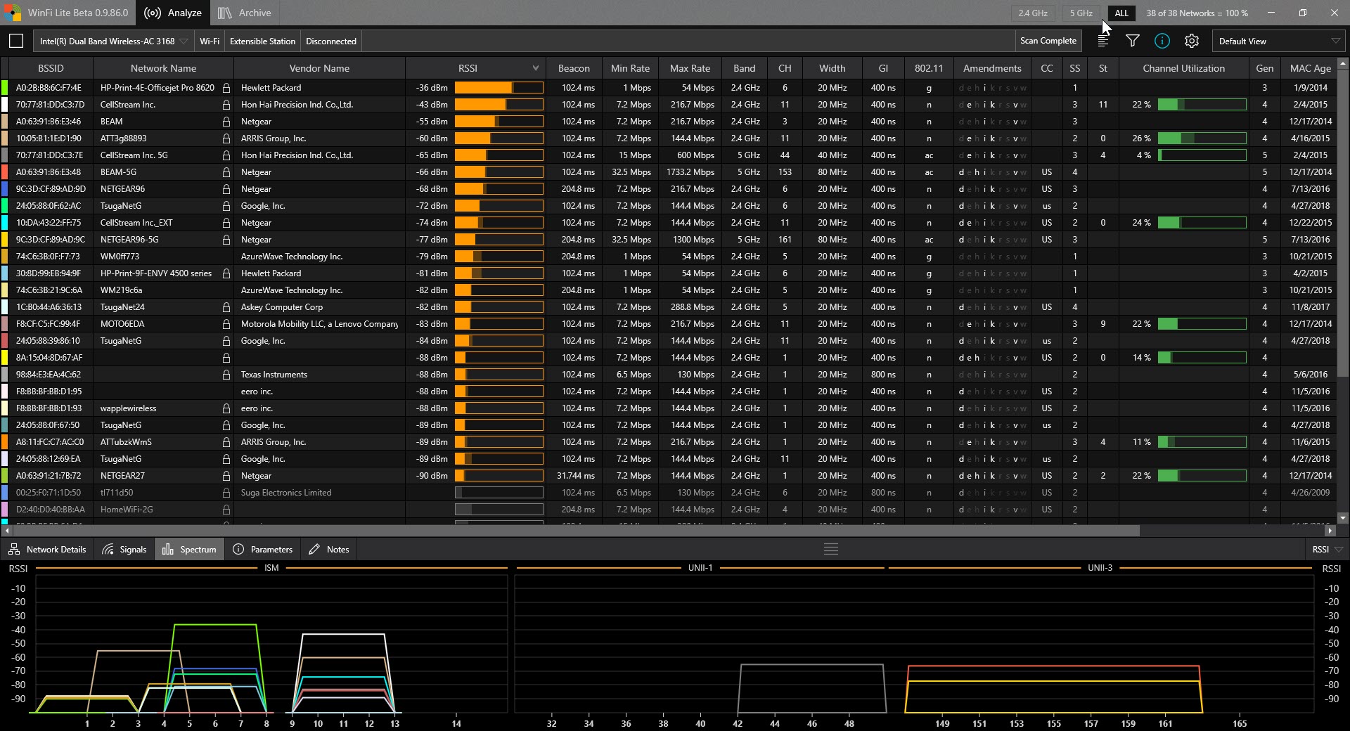 You will see Scanning<->Complete as the programs scans. Good idea to let this run a while and gather as much information as possible. Also note the three lines menu (the hamburger) in the top left. By default ALL spectrum ranges are shown. Clicking on the 2.4GHz or 5GHz or 6GHz will only show those frequency ranges.