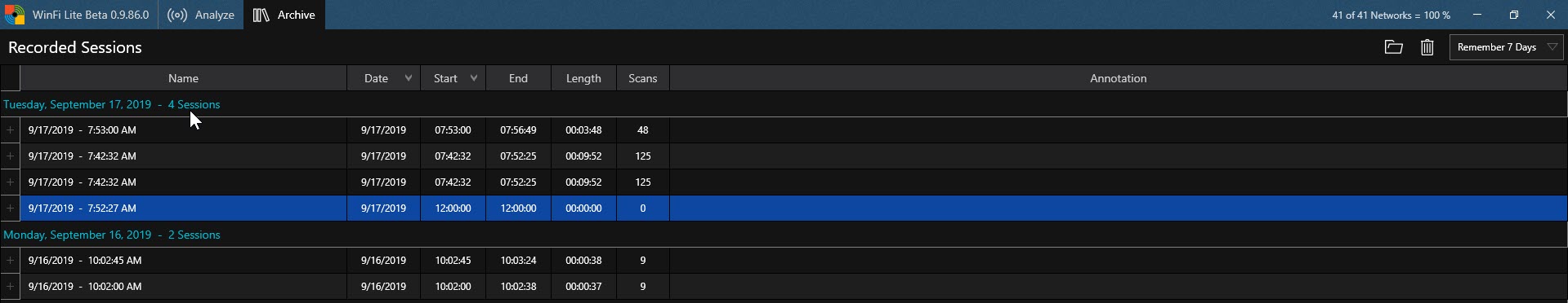 You see information about the Wi-Fi interface, and then options to open a prior WinFi saved session as well as export scan results and sessions.