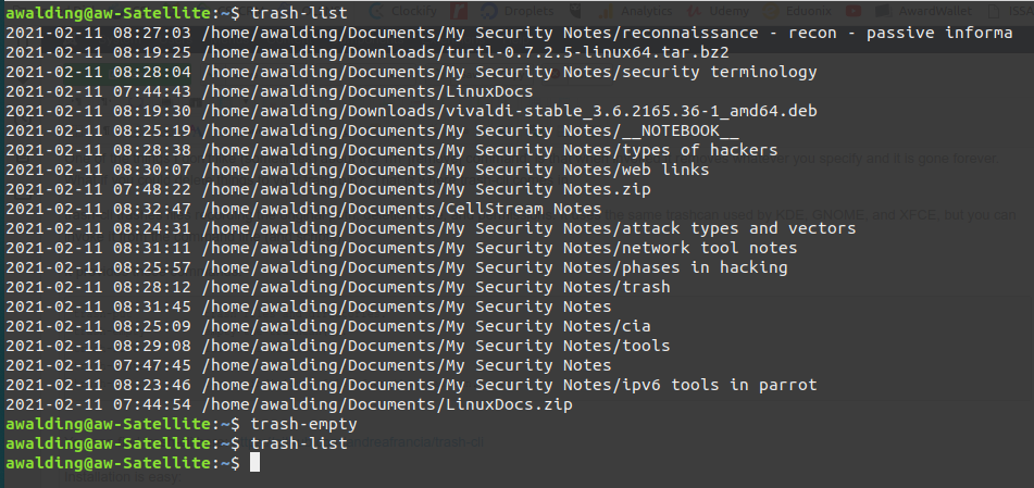 One of the things I don’t like (sometimes) about the ‘rm’ [remove] command, is that when invoked it removes whatever you specify and it is gone forever.  What if you could delete things to your trash bin?  That is where trash-cli comes in.