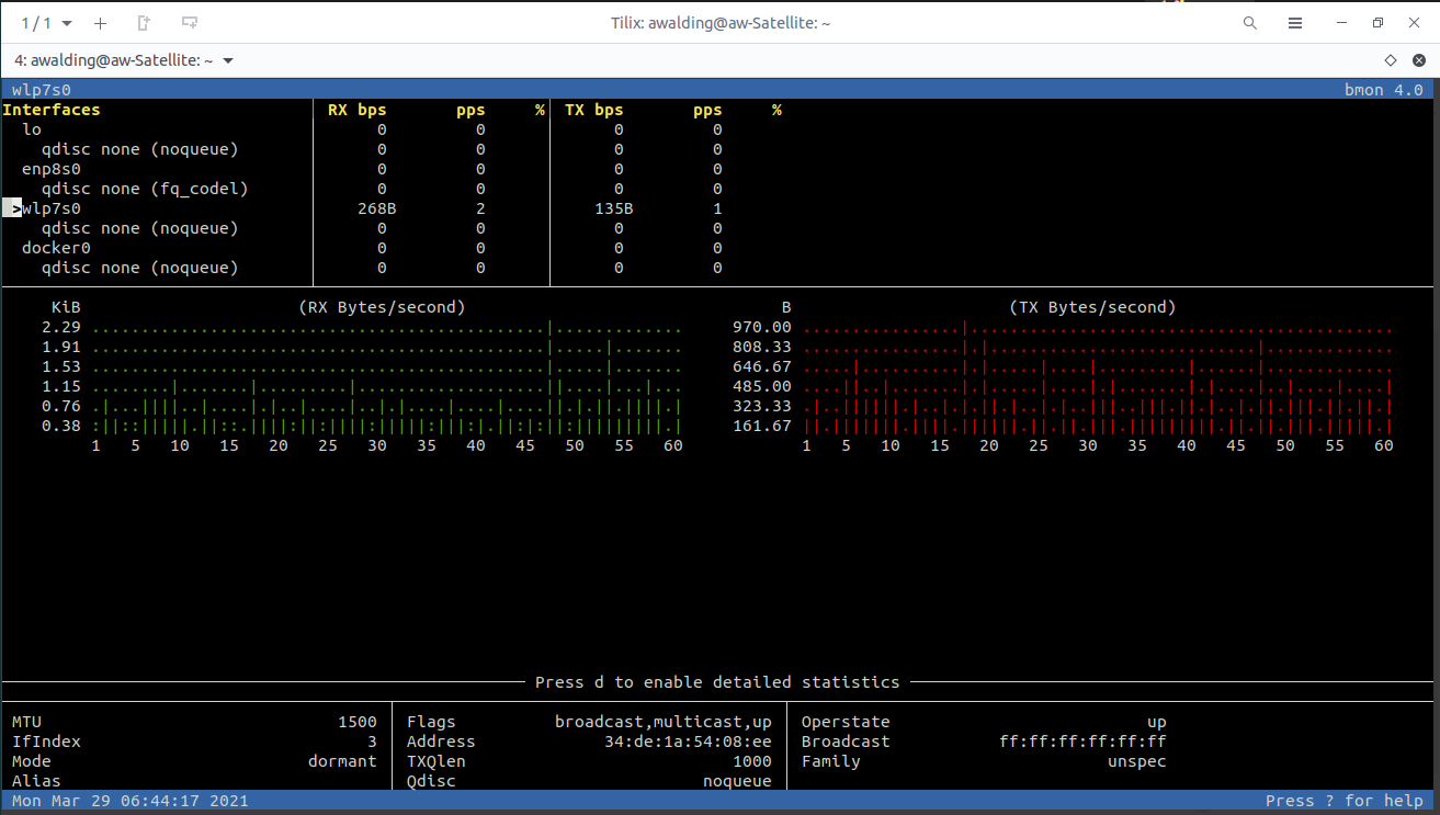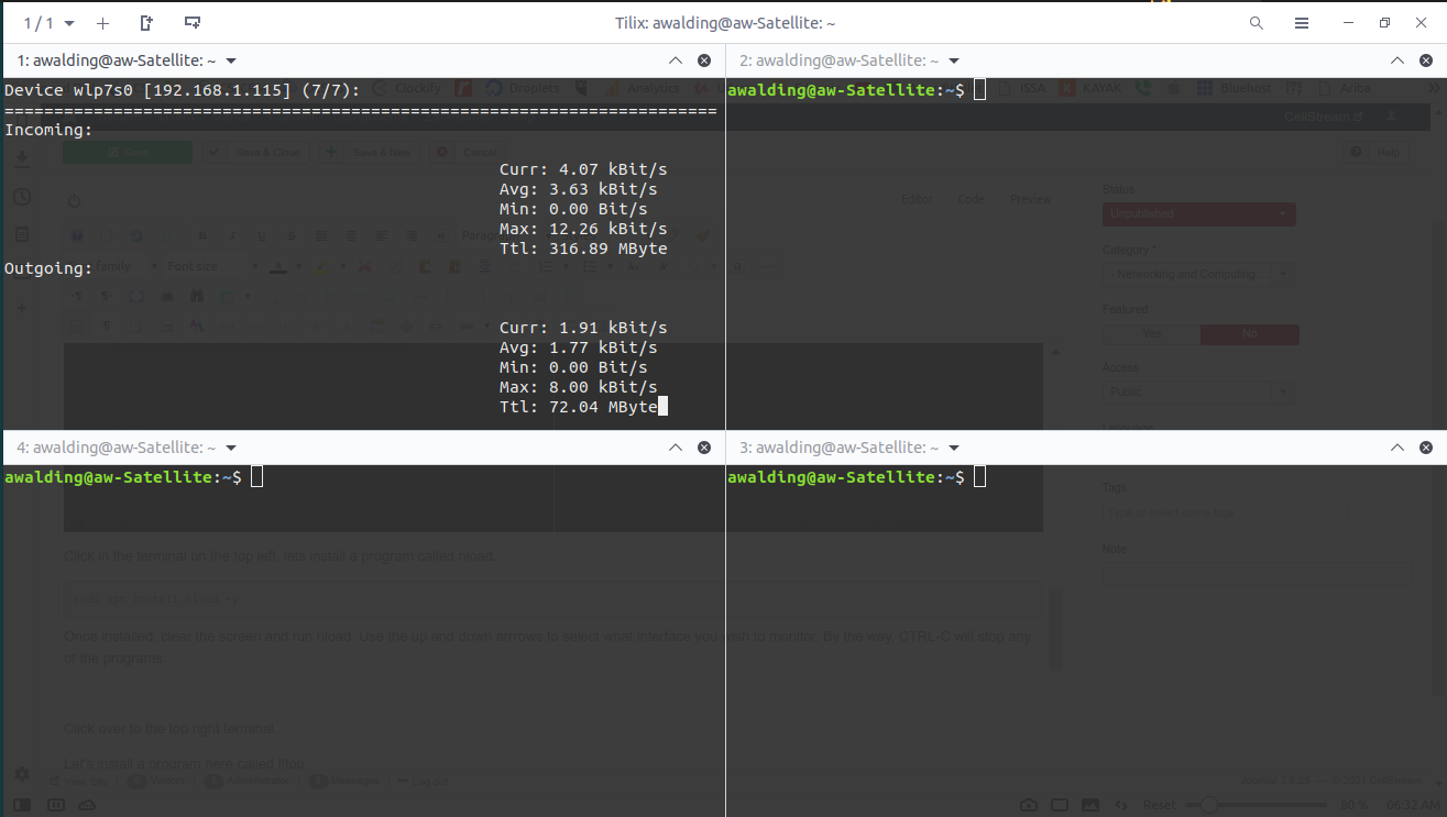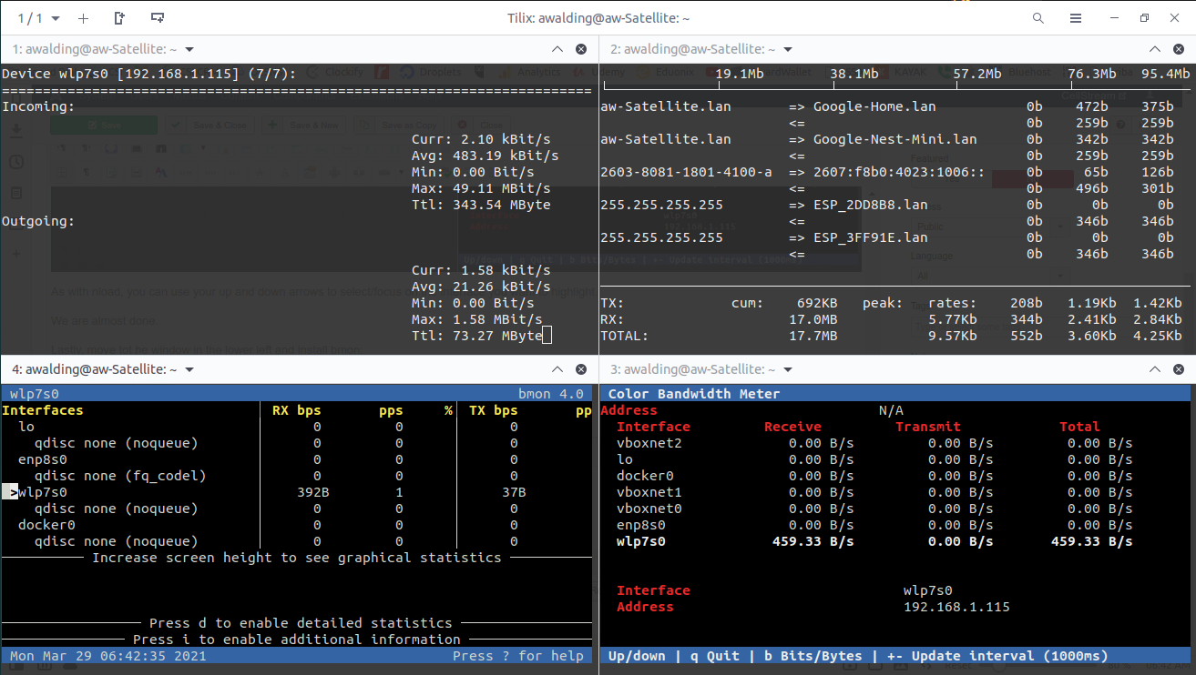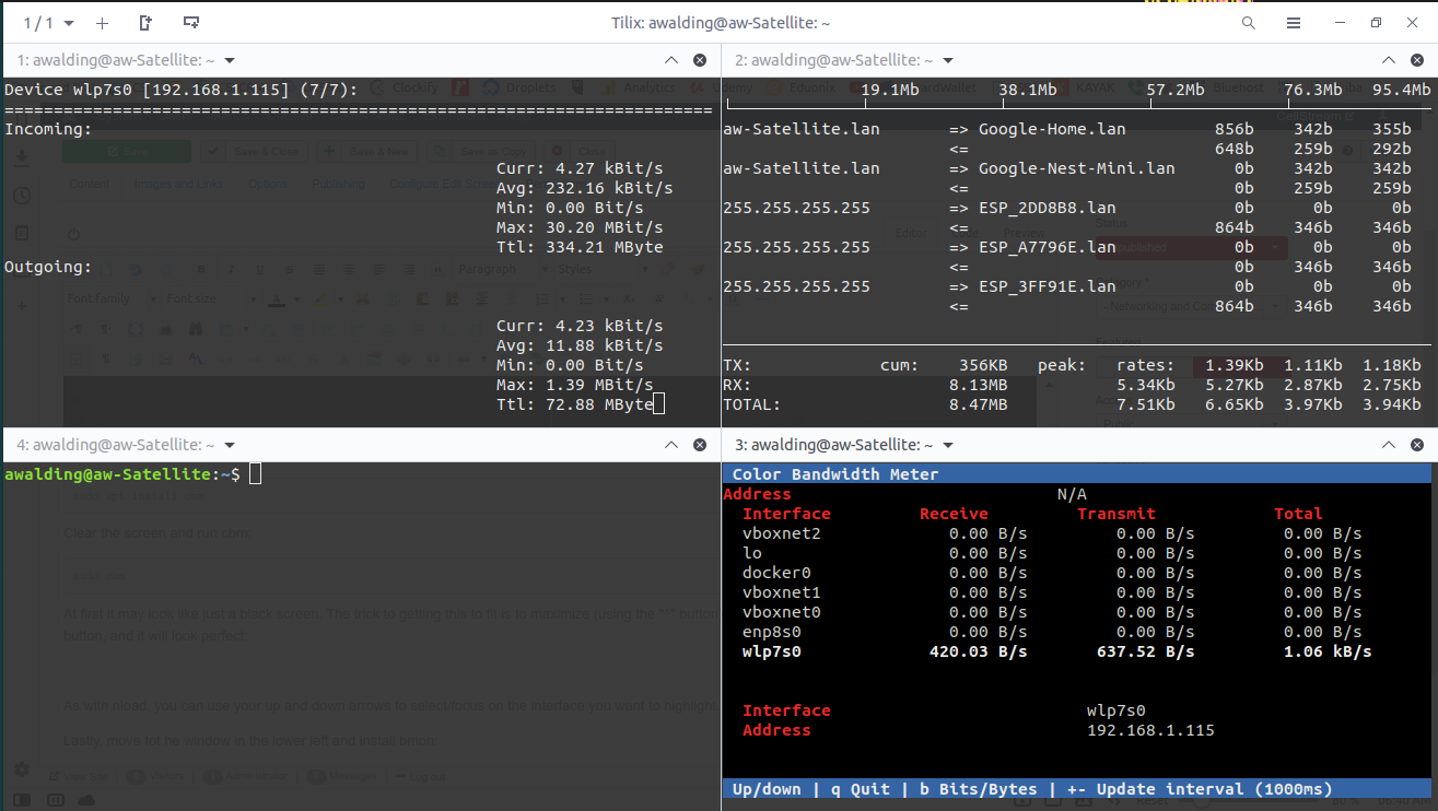 This article will discuss how to use some cool bandwidth monitoring tools in Linux so that you have a screen that looks like this:
