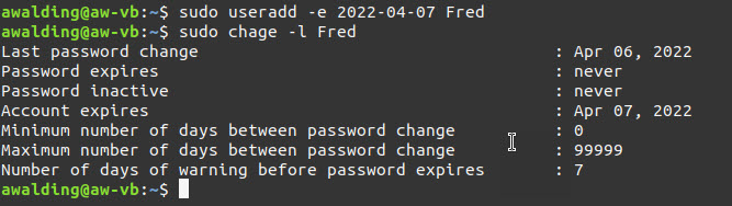 sudo useradd -e 2022-04-07 Fred
