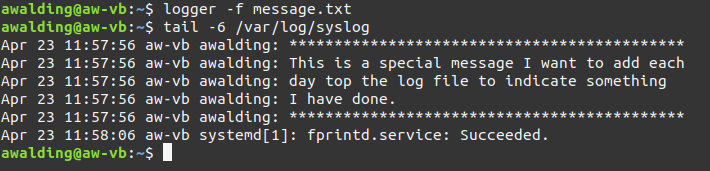 awalding@aw-vb:~$ logger -f message.txt