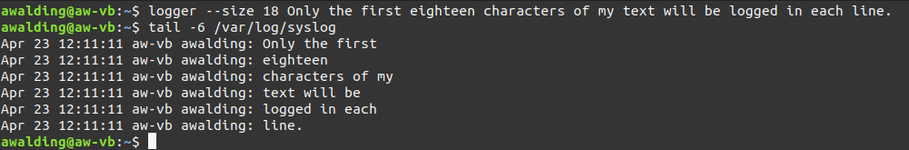 awalding@aw-vb:~$ logger --size 18 Only the first eighteen characters of my text will be logged in each line.