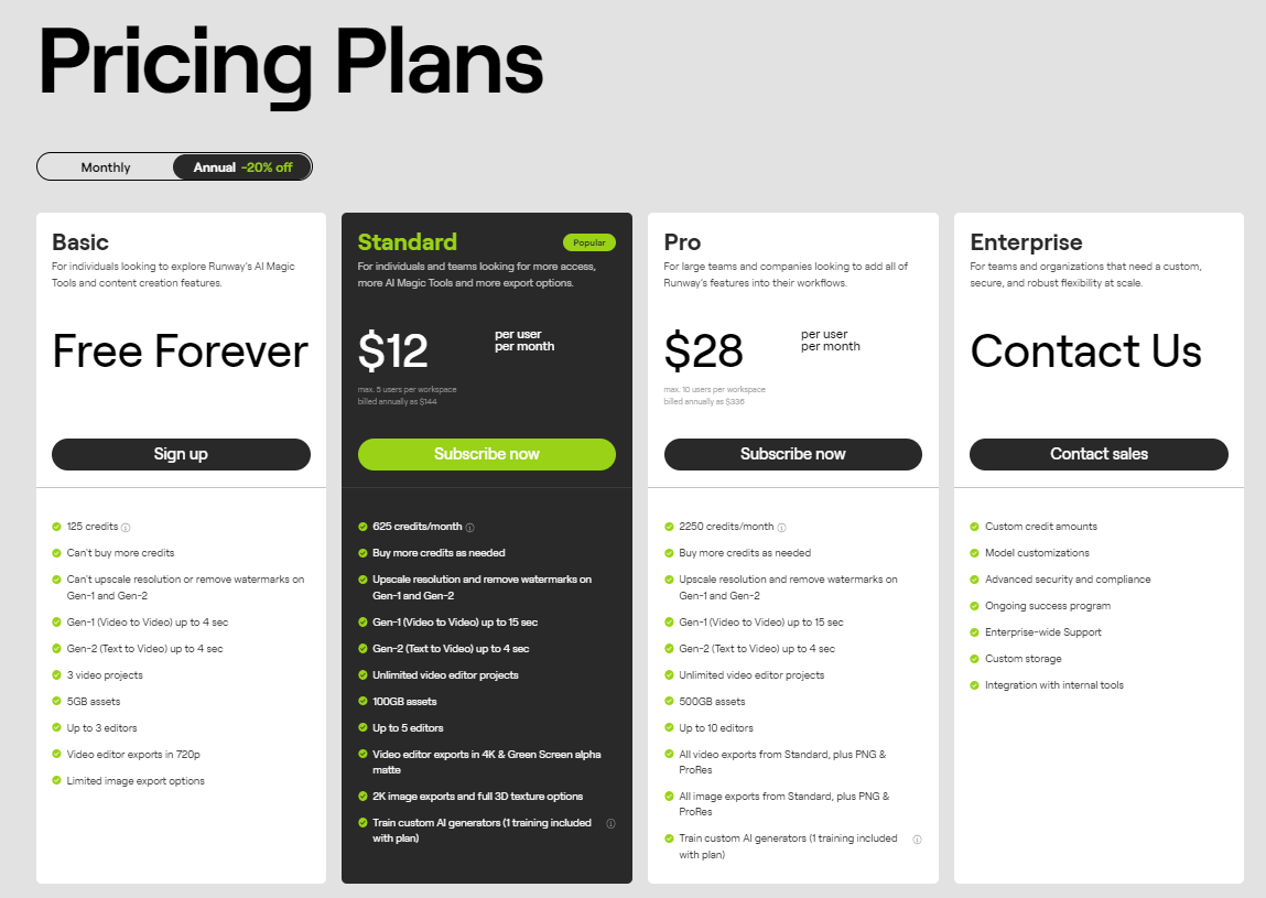One of the cool things you may want to do in generating learning or information is to create videos. There is an AI tool to do this called Runway. Their Gen 1 product uses words and images to generate new videos out of existing ones. Their Gen 2 product can create videos in any style you can imagine with Text to Video generation. If you can imagine it, you can generate it. The web site can be found here: https://runwayml.com/ and they have a free plan you can use to test it out and try the technology. Here is their pricing plan as of the writing of this article: