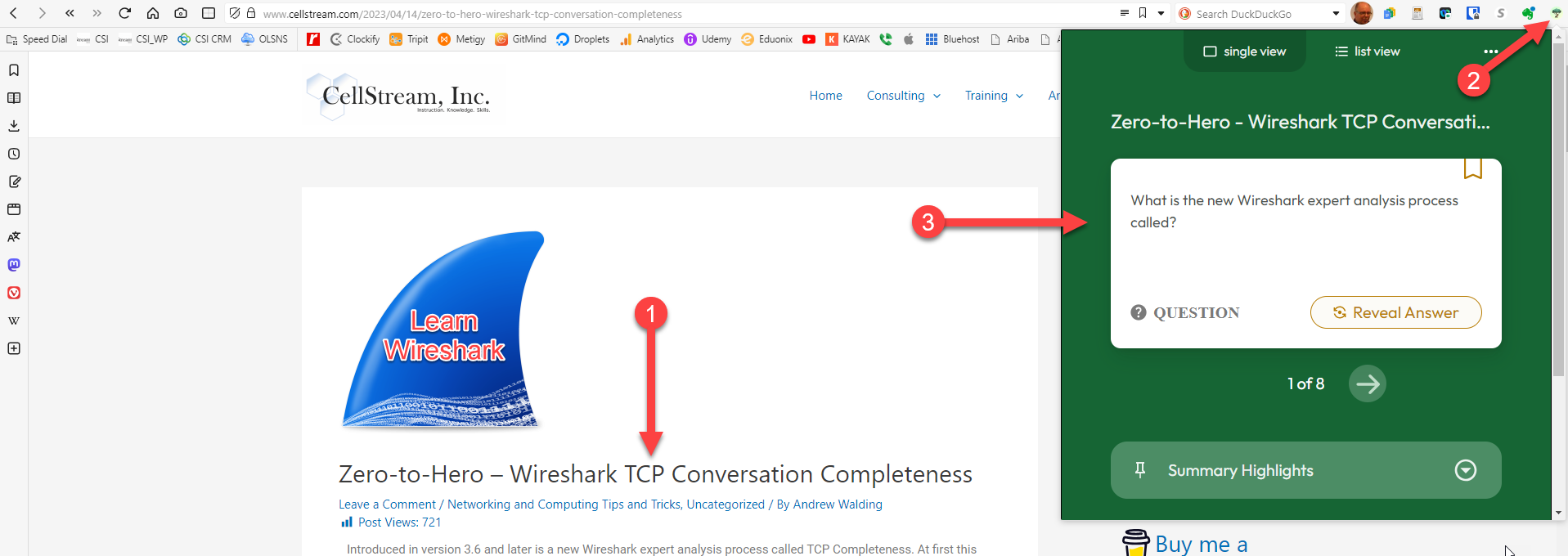 OK here is an interesting tool especially for educators: it is called Wisdolia, a Chrome Extension, and it allows you to use AI to generate flash cards from any article, PDF, or YouTube video to improve retention. Wisdolia auto-generates flashcards with questions and answers for any YouTube video, article, or PDF so that you can easily integrate knowledge into your long term memory. It also generates a summary that provides an overview of what the text or video is about. You can find the tool here: https://chrome.google.com/webstore/detail/wisdolia/ciknpklcipibmfbgjmdmfdfalklfdlne and it appears to be free. Below, after installing the Wisdolia extension, #1 I went to a web page, #2 I clicked on the Wisdolia icon, and #3 a flashcard popped up asking me a question to exercise my mind: