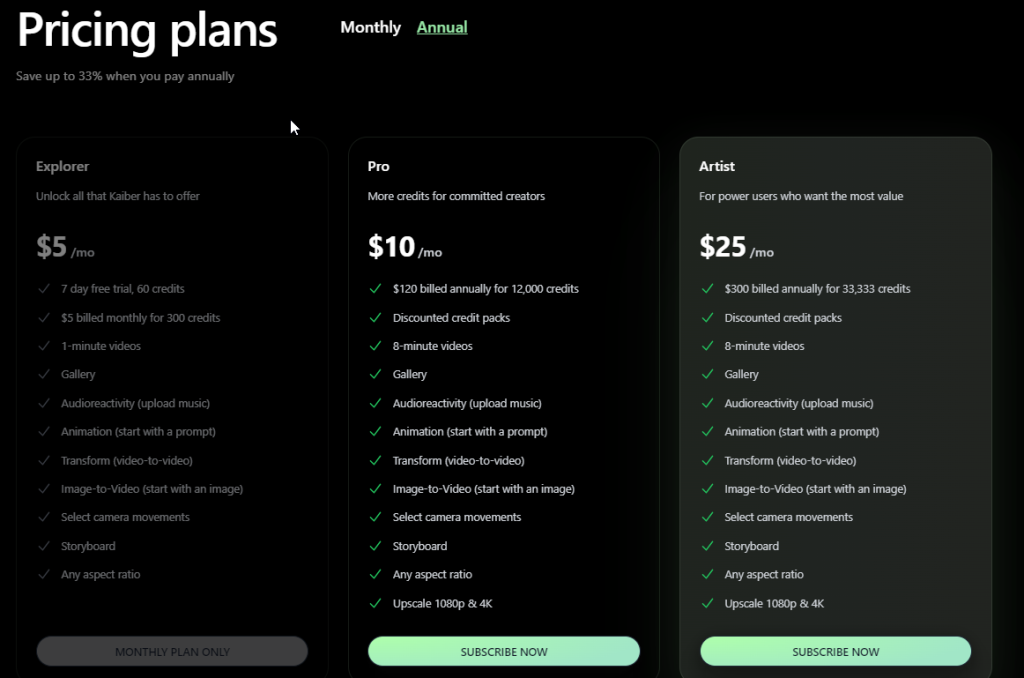 There is another video creation AI tool called Kaiber. Kaiber lets you upload an image and then using some text prompting, you can create these fascinating little video clips. You can find Kaiber here: https://www.kaiber.ai/ and their pricing is as follows: