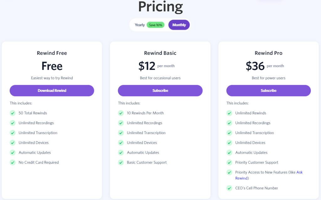 While only available for MAC at the time of this writing, there is a really clever idea called Rewind. Rewind let’s your MAC record audio, video and screen while using different (specified) apps and then makes those recordings searchable and replayable. Everything is stored on the local machine, but imagine how good this would be for business meetings, reporting problems, learning recall and so much more. You can find more info on Rewind here: https://www.rewind.ai/ and we can all hope that this is brought on other platforms as well. Here is the pricing: