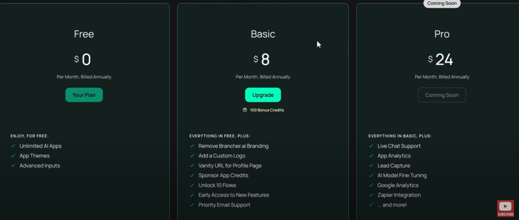 OK, what if you are a little more advanced and want to leverage AI tools to help you in your content creation? A toolset called Brancher may be your answer. This toolset allows you to connect various AI tools to build your own mini AI aps without code! There are a number of examples already provided at their web site so you can explore and learn about this. You can find more details at https://www.brancher.ai/ The pricing model for brancher is as follows: