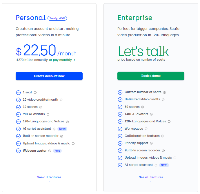 Let’s go a little simpler on the video theme. Let’s say you have written a script, and want to convert that into a video without all the production and editing overhead. The answer is held at Synthesia, an AI tool that let’s you create videos in as little as 15 minutes. You can try Synthesia here: https://www.synthesia.io and their pricing is as follows: