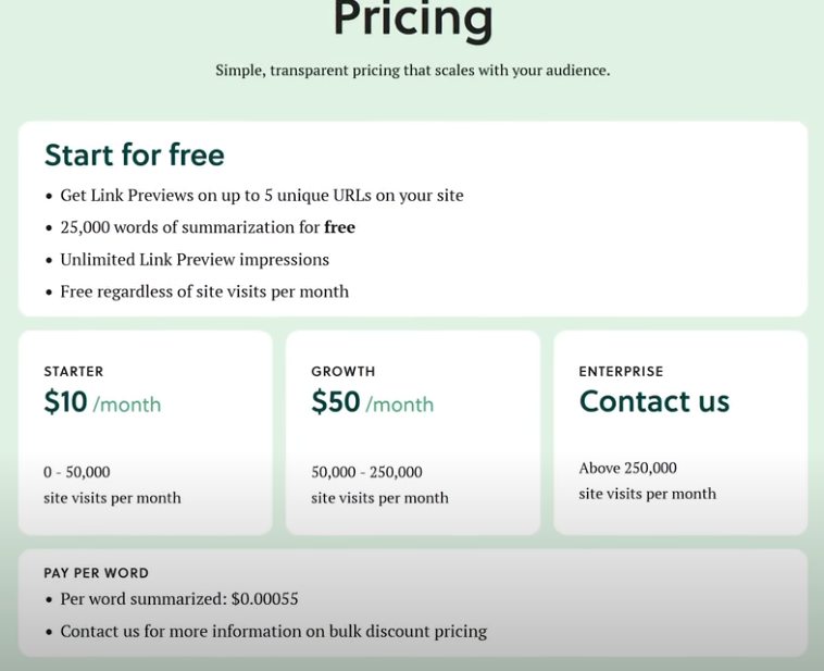 Many companies and individuals write articles to inform, educate, or even put forth an argument. In today’s reduced attention span, to draw readers into these immersive and researched articles, you need a great summary of the content. Sounds like a great job for AI! Summari is a great tool that does just that, if analyzes your content and then provides a summary of the content, You can read more about this tool here: https://www.summari.com/products/link-previews Pricing is as follows: