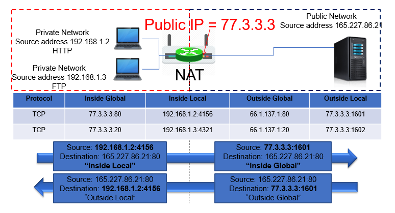 NPAT (also known simply as Port Address Translation, PAT) extends NAT by translating both IP addresses and port numbers, allowing even more devices to share a single public IP address. An example is shown in the illustration.