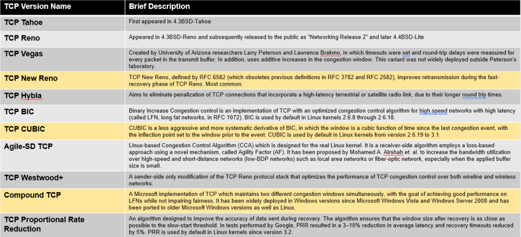 Now, I highlight TCP CUBIC, New Reno, and Compound TCP as the most common, but that is not the whole and perfect truth.
