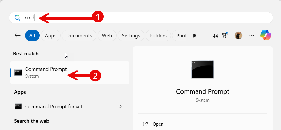If you are a Windows user, click on the Windows Start, then type ‘cmd’ in the search window, then select the Command Prompt: