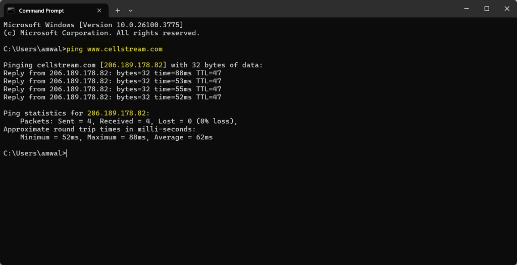 Now type in ‘ping www.cellstream.com‘ replacing www.cellstream.com with the web site you are attempting to find out the IP address of.