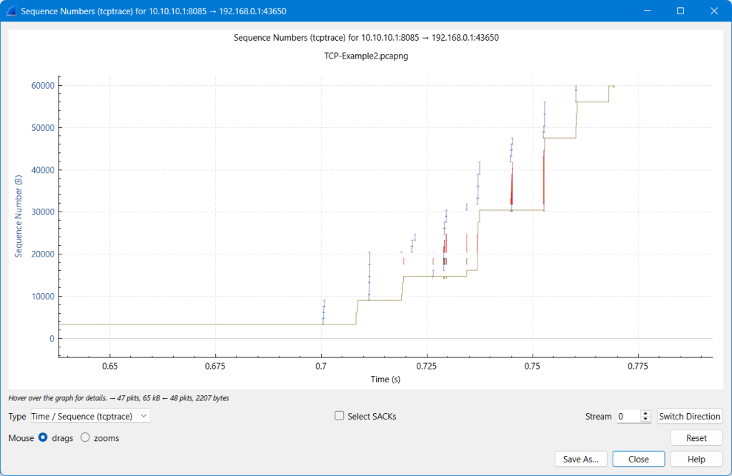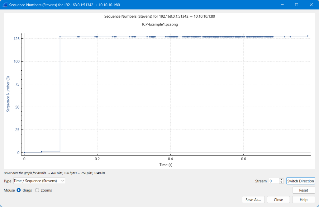 The left vertical axis (y axis) is the sequence number of the packets in the conversation and the horizontal axis (x axis) is relative time in seconds. This is why this graph is called the Time/Sequence graph. Stevens graph is used in honor of W. Richard Stevens, a renowned computer scientist and author known for his seminal books on TCP/IP and UNIX programming.