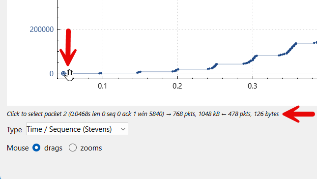 You will see the dot is circled next to the hand cursor. The italic text will tell you what packet is highlighted, followed by details as to the SEQ, ACK, and Window size. As you slide your cursor across the screen over these dots, that information is updated.