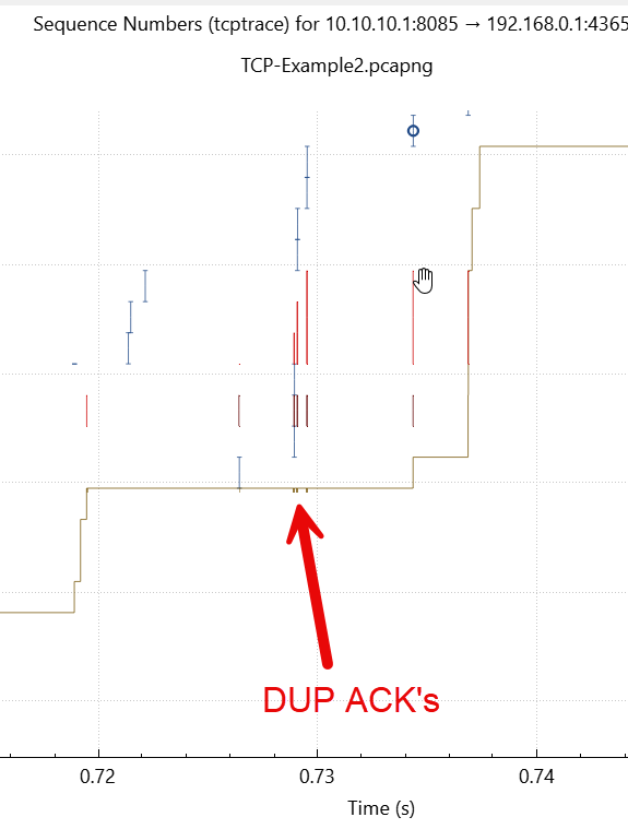 They are hard to see, but the hash marks on the gold line or ACK line are Duplicate ACK’s or DUP ACKs. DUP ACKs can be recognized in the TCP trace graph because the ACK line does not increase, and small hash marks below the line are visible. DUP ACKs are used in packet loss to trigger fast retransmissions. Too many DUP ACKs can be an indication of too many packet losses: