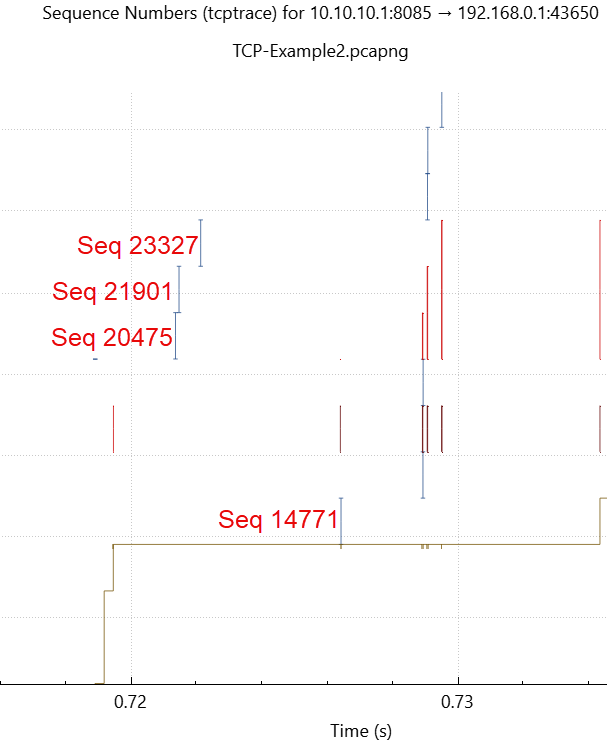 Above, the sequence numbers (remember by hovering on a blue segment, you get the info in italics). We can clearly see that SEQ 14771 came after and out of order from the three other packets noted.