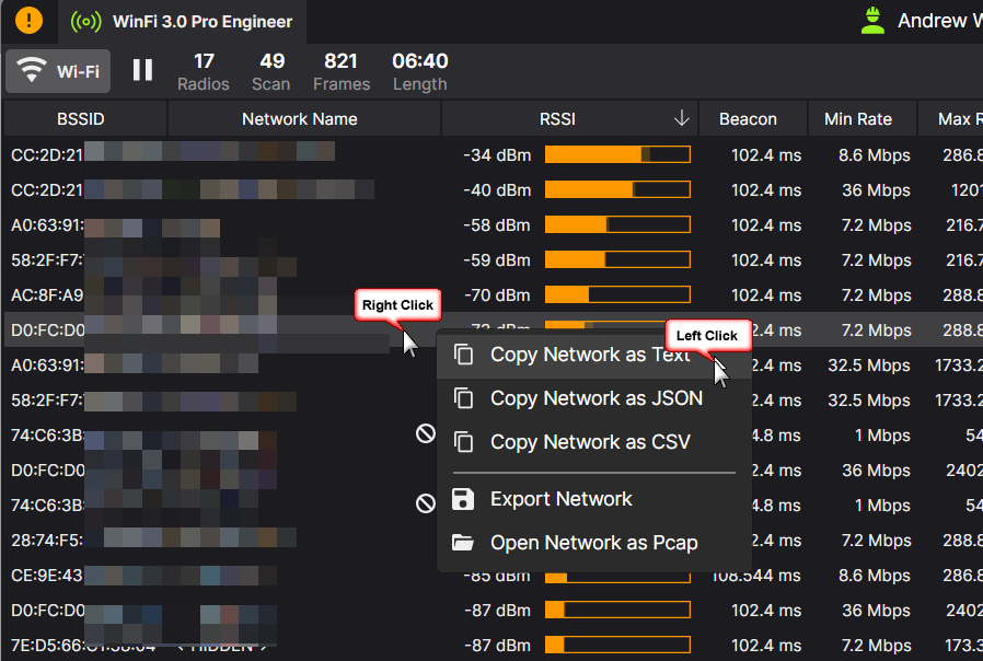 Option 1, simply select the WLAN Network Name you are interested, again, right click, this time selecting Copy as Text:
